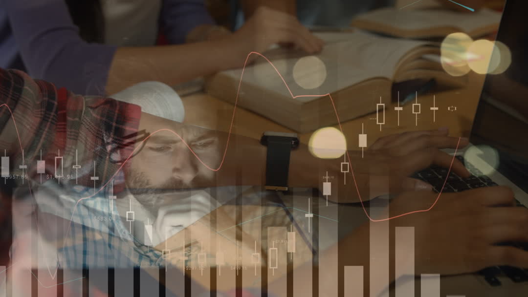 Stock data is overlaying books, combining an analysis and research concept with finance. Potentially used for illustrating articles on finance education, stock analysis, MBA projects. Suitable for representing the blend of technology and traditional study methods in documentaries about the future of education and careers in finance.