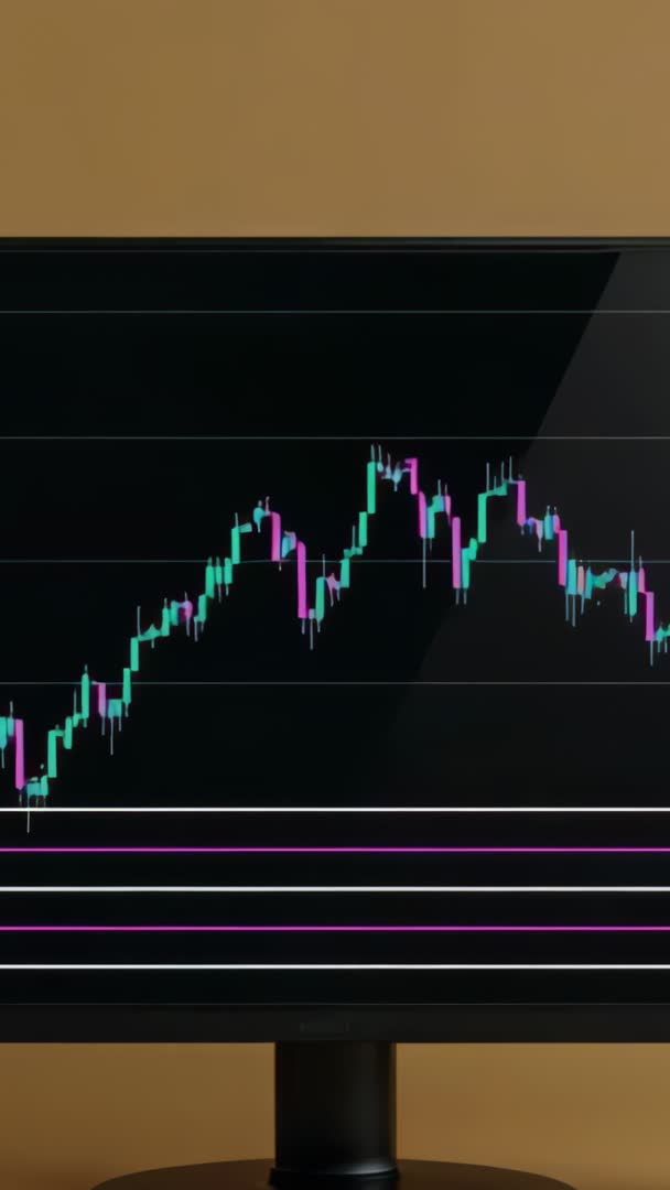 AI Generated Image. Vertical video showing candlestick chart loading on monitor with support lines appearing and price dipping then rising. Displaying colorful candlesticks and horizontal support levels on dark dashboard, creating clear contrast for data visualization. Serving to illustrate technical analysis, trading strategies, market volatility, risk management, investment decision making. Suitable for use in financial presentations, trading course content, social media short clips, website hero reels, online ads for trading platforms, investor reports, app demos. Design suggestions: pairing with upbeat background music, overlaying text highlighting support and resistance levels, adding voiceover explaining strategy, cropping to 9:16 for mobile stories. Target audience: marketers, instructors, financial analysts, fintech startups, trading educators, content creators focusing on investing. Color palette and line styles offering easy brand customization for cohesive visual identity.