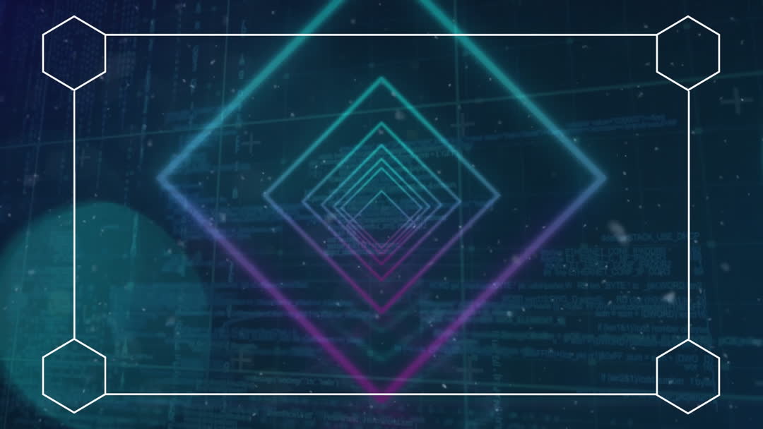 Repeated neon shapes overlay dynamic, futuristic data processing interface. Represents digital technology themes and concepts in a visually captivating way. Ideal for use in technology content, digital art projects, or futuristic presentations.
