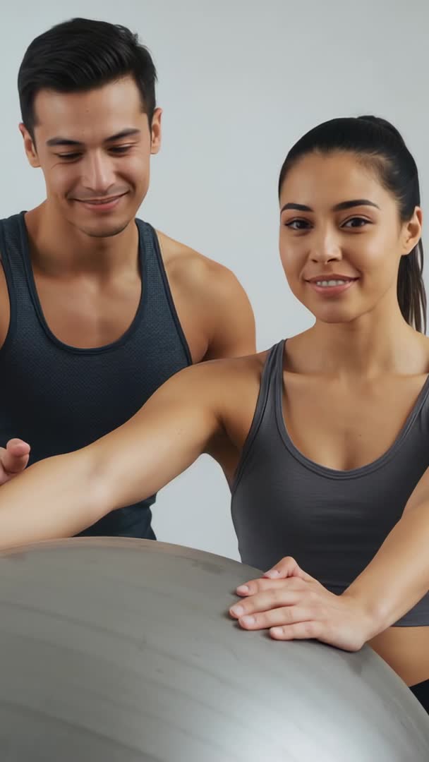 AI Generated Image. Vertical video showing male trainer guiding female client during stability ball exercise in minimalist studio. Trainer steadying client arm on silver exercise ball while client smiling and engaging core muscles. Close-up composition highlighting hands-on coaching, posture alignment, and teamwork between trainer and client. Neutral background and matching dark tank tops creating modern, clean aesthetic. Creative uses: social media vertical ads, Instagram Reels, TikTok, YouTube Shorts, fitness app tutorials, personal training websites, gym marketing, wellness blog headers, and rehabilitation demo reels. Suitable for promoting hands-on coaching, balance and core classes, partner workouts, small group training, and corporate wellness campaigns. Suggested captions: "Guided balance training for stronger core", "Hands-on coaching for safer workouts", "Trainer supporting client during stability ball drill".
