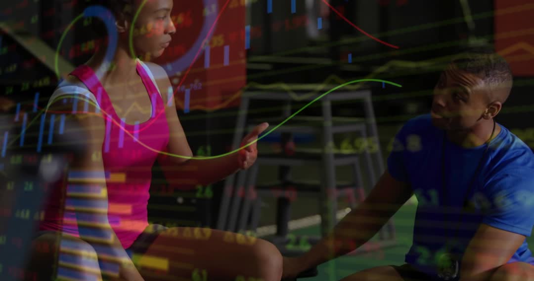 Scene Shows personal trainer guiding client in resistance training with dumbbells, symbolizing strength building. Video capture features stock market graph overlay, blending fitness and finance themes. Perfect for illustrating financial analytics in sports, investment in health, or dynamic training methods.