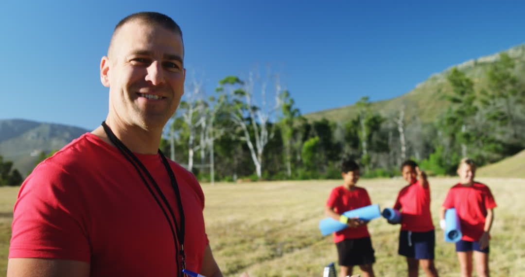 A positive situation with a male trainer leading an outdoor boot camp session. Young participants can be seen holding exercise mats against a background of nature. Ideal for illustrating concepts related to fitness, child education, team-building activities, or outdoor exercises.