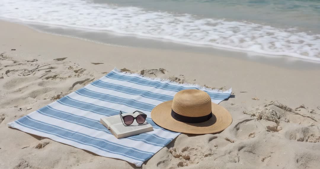 AI Generated Image. A serene beach setting with waves gently lapping the shore. A blue and white striped towel lies on the sand alongside a straw hat, sunglasses, and an open book, fostering a sense of leisure and relaxation. Ideal for marketing materials related to travel, relaxation, summer leisure activities, or vacation promotions. It presents a perfect representation of beach vacations and a carefree lifestyle.