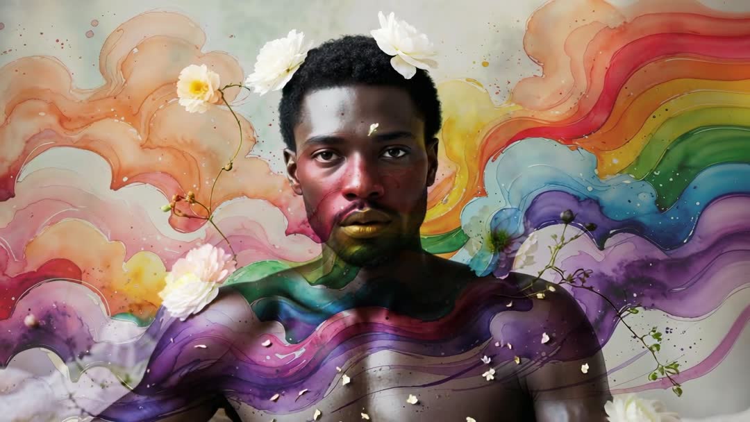 AI Generated Image. This vibrant artwork features a man surrounded by a dynamic display of rainbow colors and white blossoms. Perfect for illustrating themes of self-expression, creativity, and wellness. Suitable for use in publications related to contemporary art and modern design, as well as projects emphasizing personal tranquility and abstract beauty.