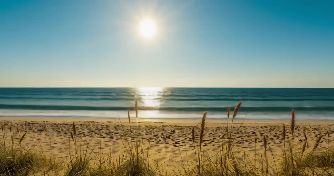 AI Generated Image. Video showcases peaceful beach scene with gentle ocean waves under bright sunset. Dune grasses swaying in light breeze create tranquil and natural atmosphere. Ideal for backgrounds emphasizing relaxation, calmness, or nature themes.