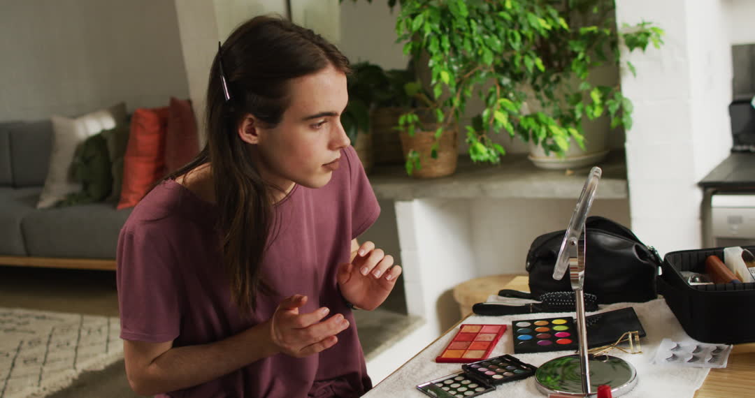 A transgender person is enjoying a personal moment by applying makeup in the comfort of their home. The scene is peaceful and showcases their focus on self-expression and experimentation with beauty styles. This video is perfect for illustrating concepts of individuality, self-acceptance, gender identity, and inclusivity in lifestyle articles, blogs, or campaigns promoting diversity and body positivity.