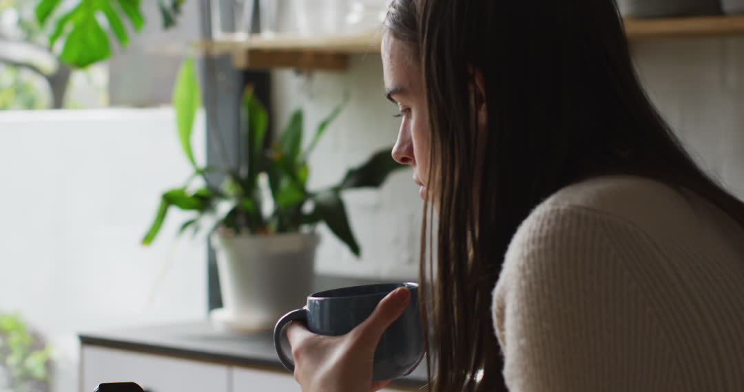 - Transgender Person Using Smartphone and Drinking Coffee in Kitchen