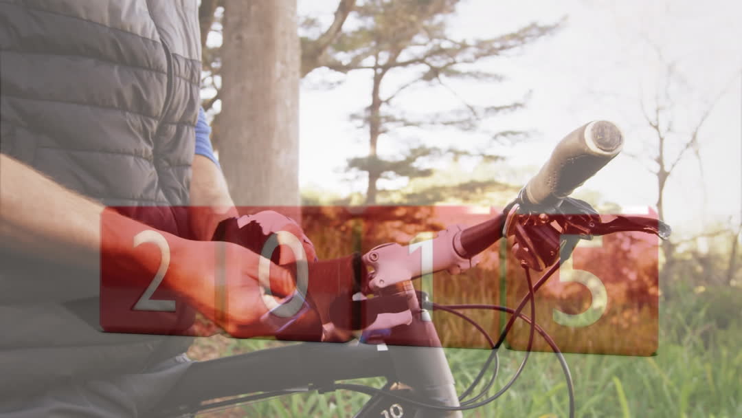Image displays an animated transition from 2014 to 2015, interposed over a view of a man adjusting his helmet while preparing to cycle. The setting implies outdoor adventure, emphasizing safety and a focus on healthy lifestyle choices. Useful for illustrating themes of new beginnings, time transitions, or cycling safety campaigns.