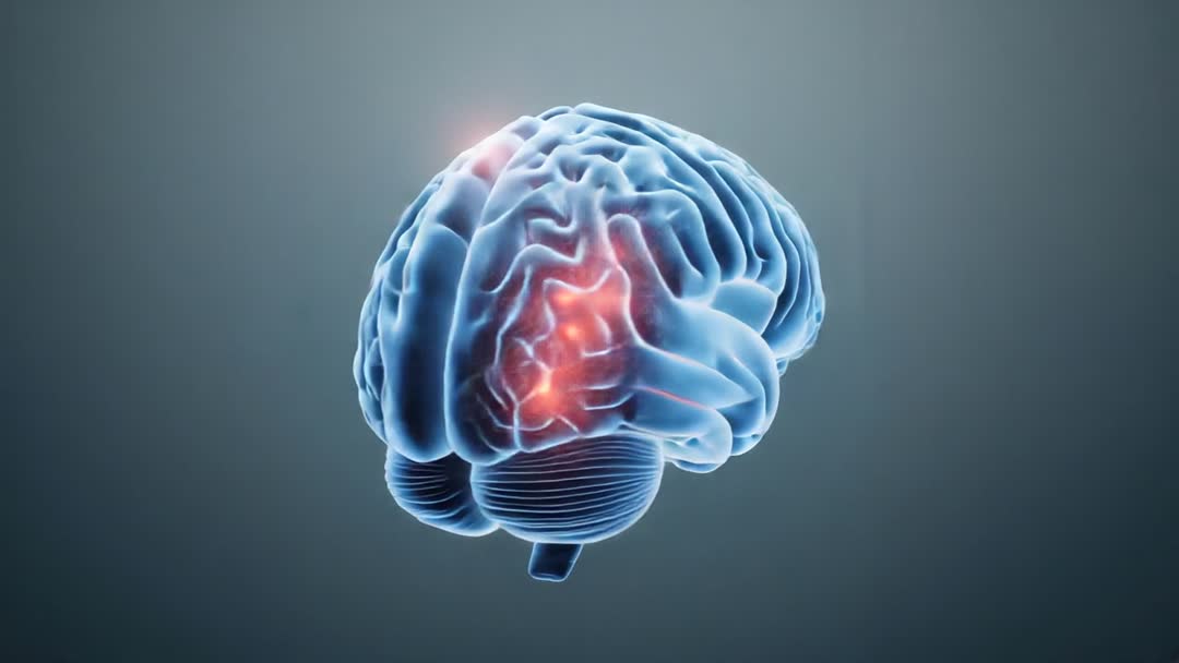 AI Generated Image. Short looping animation showing translucent 3D brain rotating with pulsing red activations across cortex and cerebellum. High-contrast glowing highlights illustrating localized neural activity and signal transmission. Neutral gradient background and cinematic lighting creating clean tech aesthetic. Suitable for neuroscience presentations, neurology clinic websites, medical training modules, health articles, research reports, explainer videos, and social media posts. Useful as opener or background for lectures, online courses, conference slides, patient education materials, and marketing for brain health or neurotechnology products. Clip loopable for seamless playback or exportable as still frame for print and digital assets. Suggested edits: color grading to match brand palette, adding labels or infographics to highlight specific regions, overlaying voiceover or captions for educational narration.