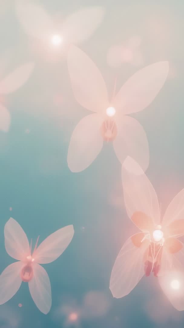 AI Generated Image. Floating translucent floral shapes pulsing soft luminous cores over teal-green gradient, with delicate bokeh and warm lens flares, creating dreamy serene atmosphere in vertical format. Providing calming backdrop for meditation app backgrounds, guided breathing sessions, wellness and spa promotions, yoga social stories, mobile ads and phone wallpapers. Suiting brand intros, wedding openers, product reveal overlays, ambient lobby loops, and screensavers. Offering loop-friendly motion and soft focal points for overlaying text or logos; reducing brightness and adding subtle vignette helps improve overlay legibility and branding contrast.