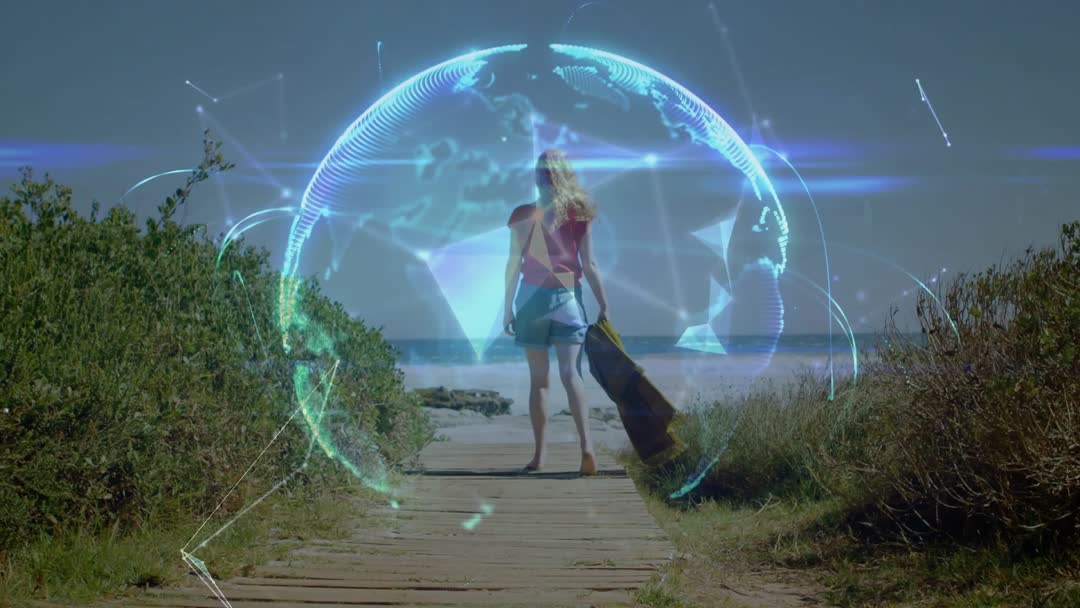 A woman carrying a board walks along a boardwalk towards the sea, blended with an innovative digital globe overlay representing connectivity and futurism. The shot illustrates themes of exploration and technological advancement. Ideal for content related to technology, digital advancements, travel innovation, and connecting people globally. Useful in presentations highlighting global connectivity and tech-influenced exploration.