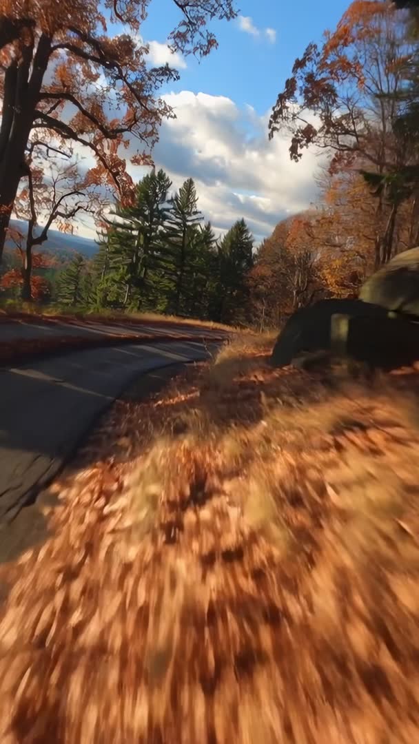 AI Generated Video. Vertical video showing camera traveling along winding road through autumn forest, revealing sweeping carpet of fallen leaves, moss-covered rocks, and distant pine trees under dramatic cloudscape. Foreground motion blur adding dynamic sense of speed while midground and background remain crisp for depth. Warm orange and brown tones contrasting with blue sky for strong seasonal palette. Use for travel vlog intros, social media reels, vertical ads, tourism promos, nature documentaries, and scenic backgrounds for title cards. Pair with slow instrumental music and simple text overlays for engaging Instagram Reels or TikTok clips. Crop safe for mobile portrait formats and suitable for looped playback or background b-roll in outdoor lifestyle projects.