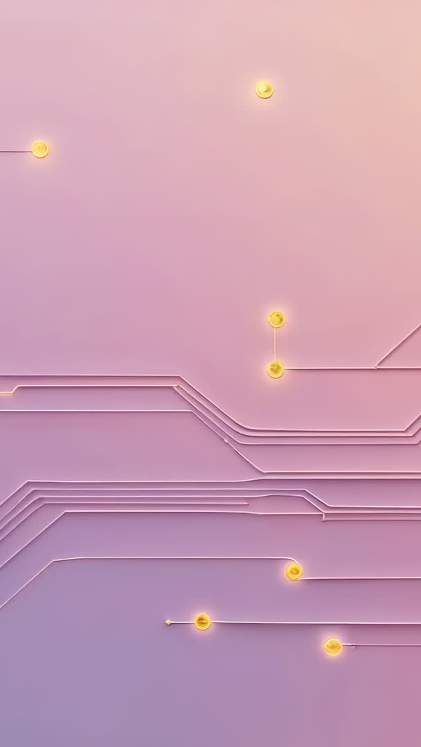 AI Generated Image. Showing traveling pulse moving along layered circuit traces over smooth pink-to-purple gradient. Featuring glowing golden nodes activating along thin paths, creating subtle neon highlights and depth. Presenting vertical orientation optimized for mobile screens, social stories, and reels. Providing loop-friendly motion for backgrounds in tech presentations, app intros, product demos, startup pitch decks, and promotional ads. Working well as wallpaper for mobile devices, backdrop for UI overlays, or hero banner in web headers and landing pages. Delivering modern minimalist aesthetic for fintech, telecom, IoT, network infrastructure, and futuristic concept visuals. Including ample copy space in upper area for headline text or logo placement.