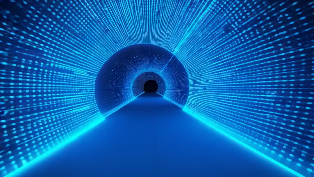 AI Generated Image. Showing camera traveling through neon-lit data tunnel toward dark aperture, creating dramatic depth and motion. Featuring rhythmic blue LED dots lining curved walls and glowing floor edges, evoking futuristic tech and cyberspace aesthetics. Working well for technology intros, product demos, corporate presentations, website hero banners, sci-fi trailers, live event visuals, social media video backgrounds. Serving as seamless loop or transition plate for motion design and VFX, offering strong potential for color grading and overlaying text and logos. Providing cinematic perspective for storytelling about speed, connectivity, data flow and virtual worlds.