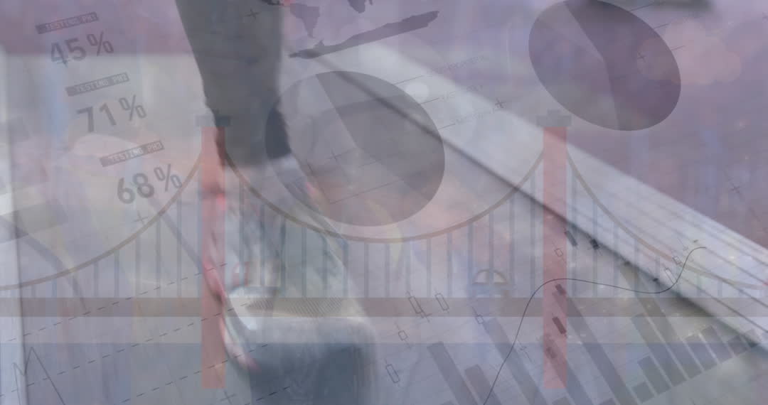 Man walking on a treadmill overlaid with digital representations of financial data, charts, and graphs, suggesting the intersection of physical health and financial analysis. Suitable for illustrating concepts of balancing lifestyle with financial management, digital finance, or showing advancements in fitness technology.