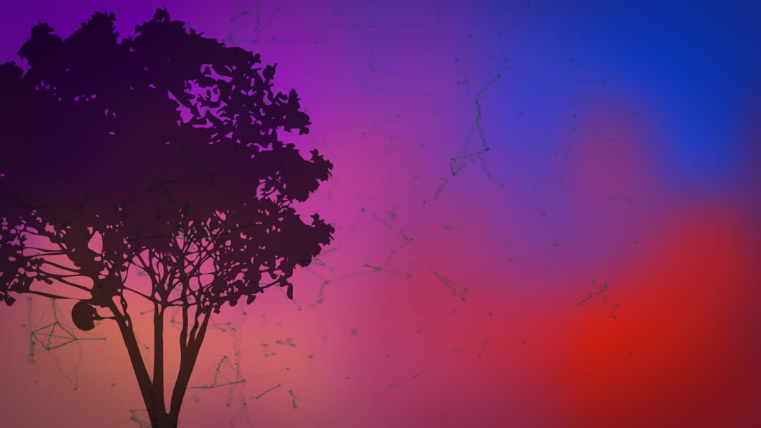 This depicts a tree silhouette set against a dynamic and colorful abstract background, featuring swirling blue, purple, and red hues with interconnected shapes. Ideal for adding a sense of movement and vibrant energy to a project. Perfect for use in digital artworks, videos, presentations focused on creativity, nature-inspired themes, and abstract concepts.
