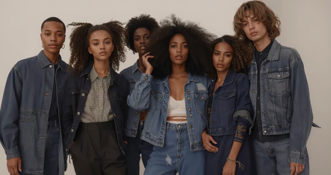 AI Generated Video. Diverse models wearing trendy denim outfits appear in a studio emphasizing style and unity. Captures contemporary fashion trends along with collaboration and youthful elegance. Great for fashion industry visuals, style magazines, advertising campaigns.