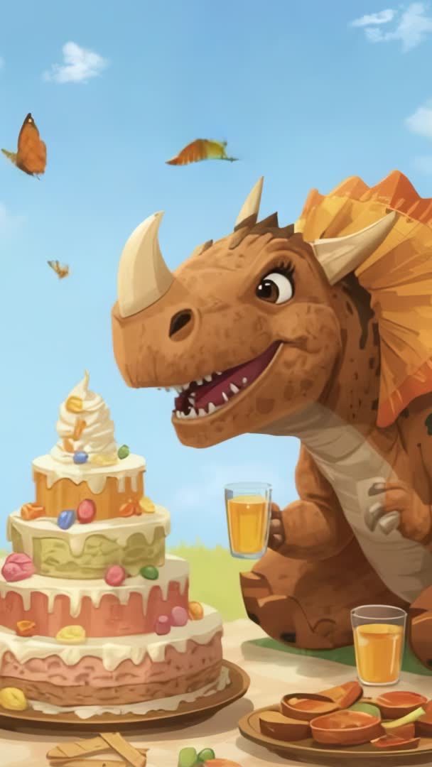 - Triceratops enjoying picnic party with cake and butterflies vertical video for kids