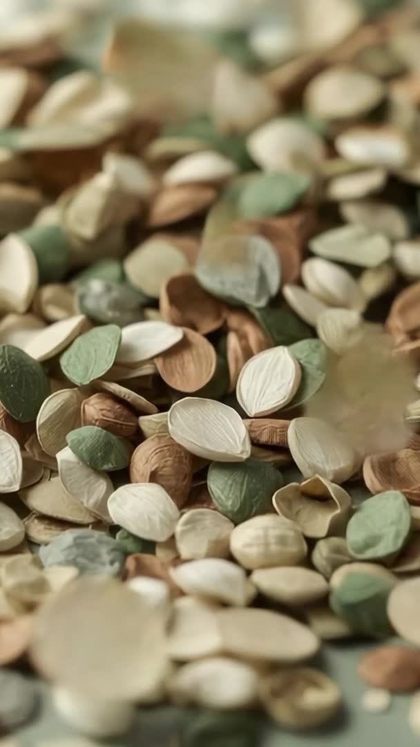 AI Generated Image. Showing tricolor seeds drifting slowly onto tabletop pile, creating gentle motion and tactile organic texture. Emphasizing close-up vertical composition and muted earthy tones, producing calming visual rhythm and subtle pile shifts. Working well in wellness and natural food campaigns, adding mood to social media reels and Instagram stories. Serving as looping background for meditation apps, minimal product ads, and cooking videos. Enhancing packaging design for snack and seed brands, providing textured overlays for motion graphics and website hero loops. Recommending slow-motion playback and subtle color grading to heighten soothing, natural effect.