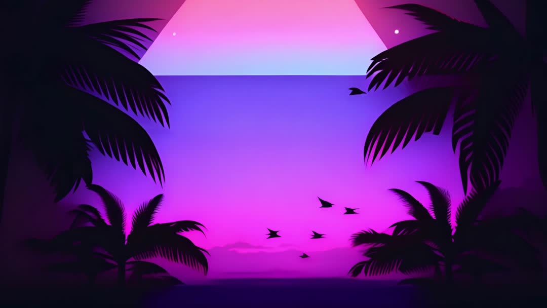 AI Generated Video. Featuring a breathtaking tropical sunset with palm tree silhouettes against a vibrant gradient sky, this digital artwork evokes feelings of relaxation and bliss. Seagulls are seen flying across the colorful horizon, enhancing the serene tropical vibe. Ideal as home or office décor for relaxation spaces, this artwork can also serve as a beautiful social media background or design inspiration.