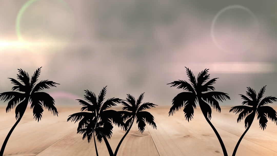 Silhouetted palm trees stand against a grey background, creating a contrast with transparent bubbles floating gently with out of focus light spots adding a celestial feel. Wooden texture provides a rustic baseline, combining nature with abstraction. Ideal for backgrounds in designs needing a blend of tranquility, dreaminess, and artistic flair. Useful for graphic artists in need of illustrative elements or those creating tropical themed content.