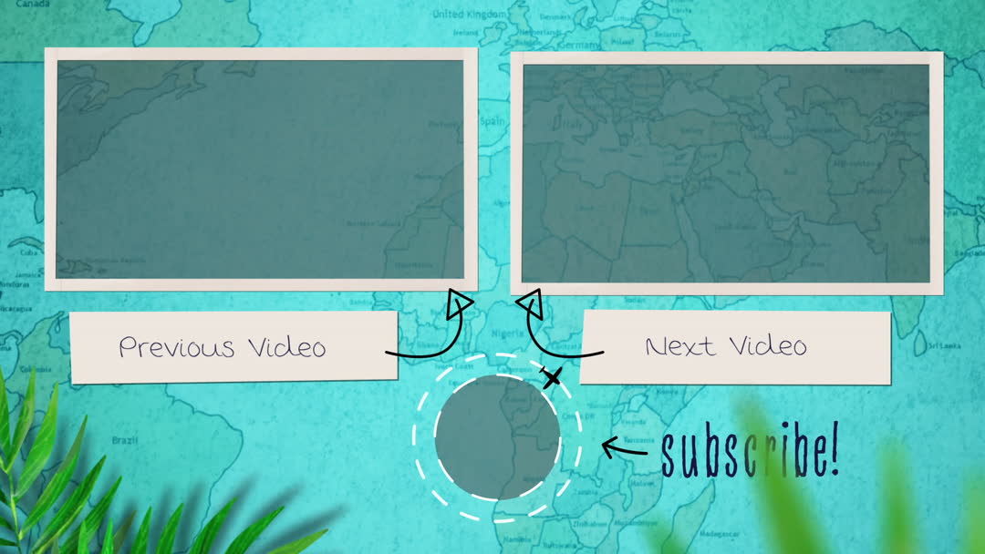 Colorful end screen template ideal for travel vloggers on YouTube. Featuring Subscribe, Previous Video, and Next Video placeholders designed to keep viewers engaged and encourage channel interaction. The world map background enhances a sense of adventure, and the lively aeroplane icon adds animation, making it suitable for insertion at the end of visually captivating travel or exploration videos.