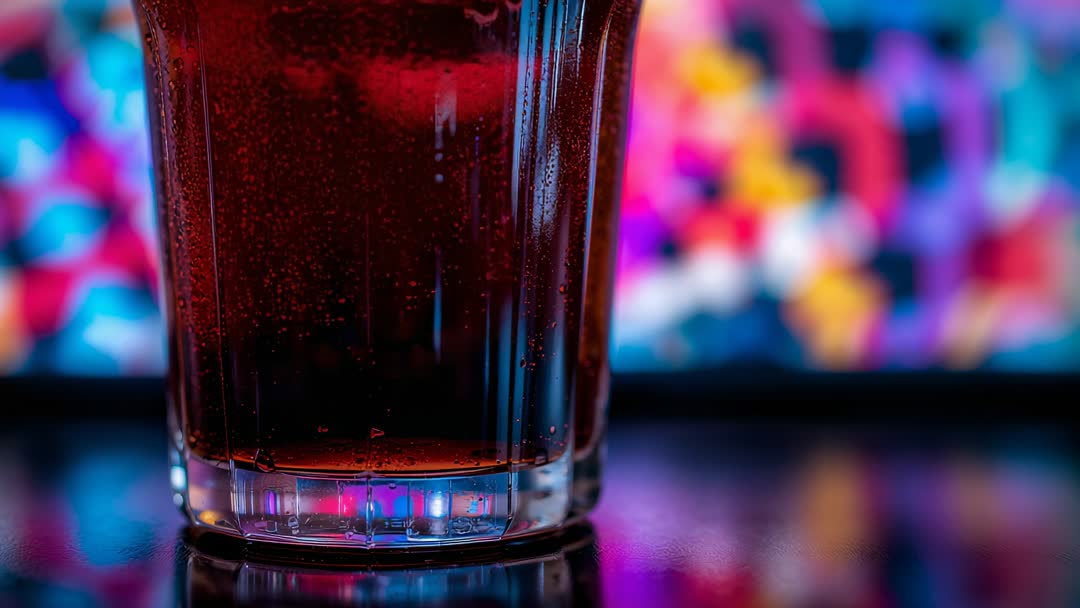 AI Generated Image. Close-up video capturing cola bubbling inside short clear tumbler, LED panels creating vibrant bokeh and colored reflections on glossy tabletop. Tiny bubbles rising and clinging to glass walls, condensation forming along rim and surface, producing tactile sparkling aesthetic. Scene conveying refreshment, nightlife mood and premium beverage presentation. Suitable for beverage advertising, drink menu promos, bar marketing, party and nightlife collaterals, social media loops, and background footage for editorial or product packaging. Recommended use as short looped clip, hero background for websites, overlay for motion graphics, or packaging mockup; color grading and fizz sound design enhancing immersive effect.