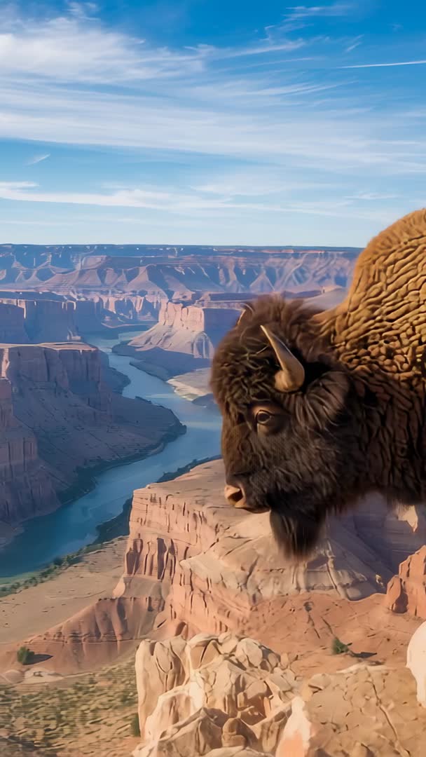 AI Generated Video. Showing bison turning into frame and peering over canyon ledge at winding river under clear blue sky. Vertical 9:16 composition providing tall, cinematic framing with large left-side copy space for titles, logos, or captions. Colors featuring warm sandstone tones and deep river blue creating strong visual contrast. Ideal for travel and tourism promos, park or conservation campaigns, wildlife storytelling, and social media reels or stories. Working as dramatic opener for nature documentary or hero shot for outdoor brand advertising. Suitable for educational content about bison and American Southwest ecosystems, website hero banners, mobile wallpaper, and editorial features about wildlife protection. Clip offering room for lower-thirds, animated text, and voiceover, and supporting slow pans or reveal transitions for cinematic impact.