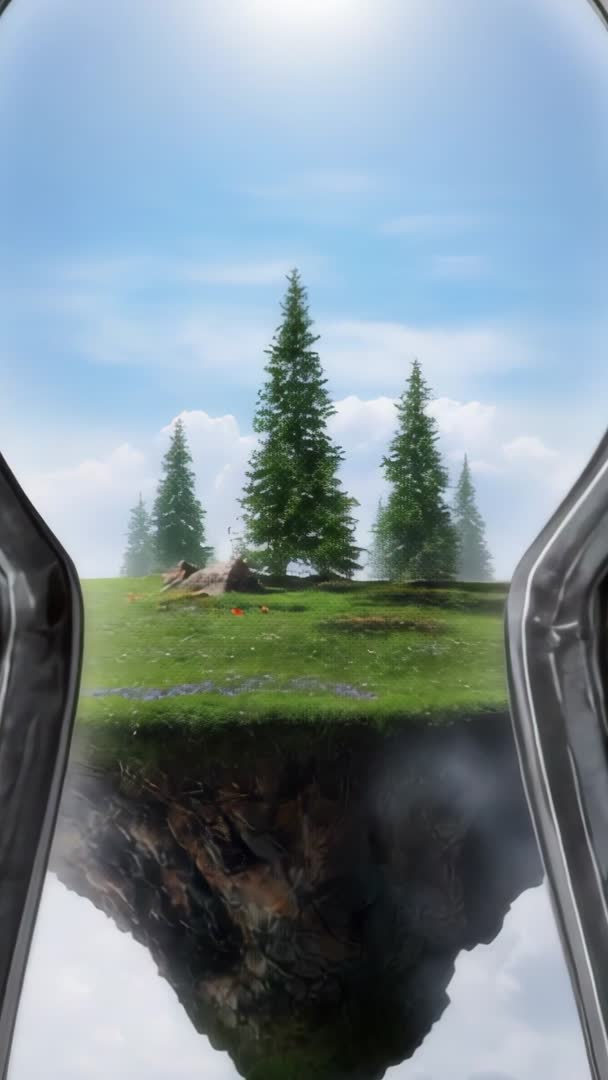 AI Generated Image. Video showing ornate door unlocking as key turning, revealing floating island with pine trees, grassy meadow, exposed roots and drifting clouds. Composition using vertical frame for mobile-first storytelling and cinematic reveal. Perfect for fantasy trailer, game intro, book cover, app splash, social vertical ad, or cinematic title sequence. Use as background plate for motion graphics, text overlays, branding campaigns, or concept art presentations. Mood evoking wonder, mystery, and invitation to explore unknown worlds.