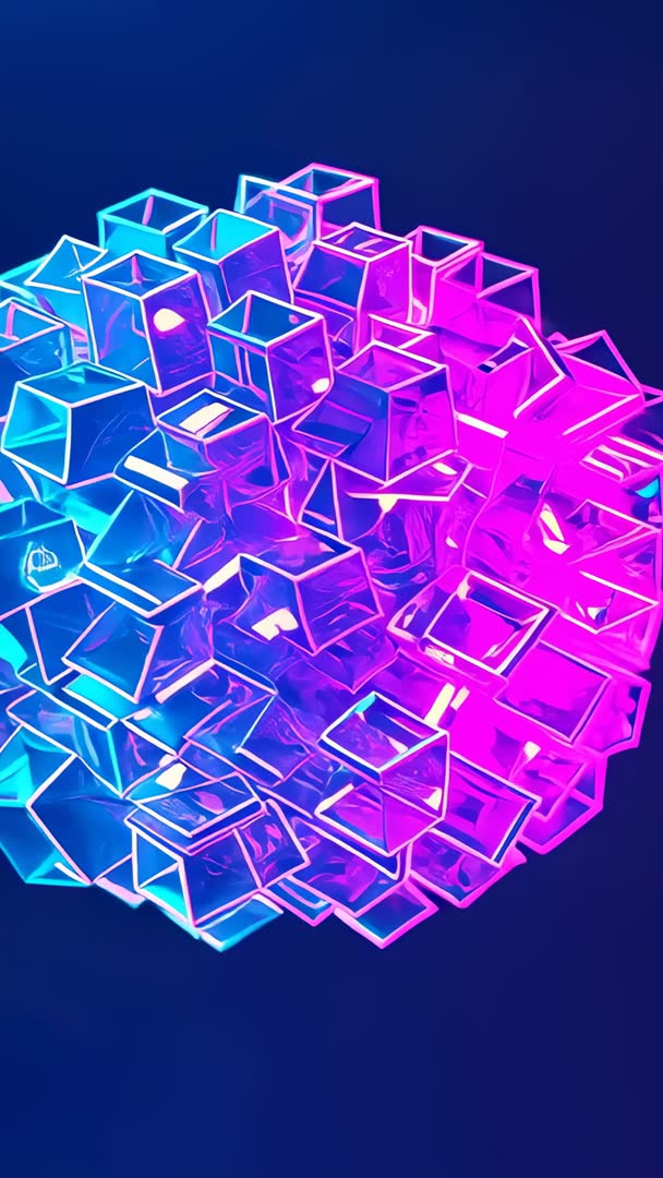 AI Generated Video. Featuring glasslike cubes turning into spherical cluster with cyan and pink neon rims over deep blue void. High-contrast duotone palette creating vibrant reflective glints and layered translucency. Vertical video format (9:16) optimizing mobile and social platforms, loopable animation adding dynamic background for music visuals, tech promos, app intros, or event projections. Motion graphics friendly source for VJ loops, streaming overlays, wallpaper, or product launch reels. Color grading flexibility allowing brand color swaps and speed adjustments to match project mood. Ideal for futuristic branding, electronic music campaigns, UI demos, and immersive visual compositions.