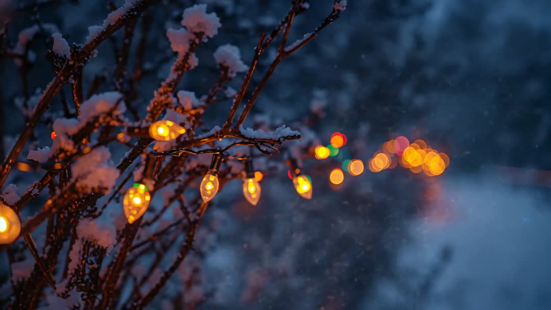 AI Generated Video. Video showing twilight panning across snow-covered branches adorned with warm glowing bulbs and gently falling snow. Cinematic shallow depth of field producing soft bokeh highlights and warm contrast against cold blue background. Useful for holiday commercials, social media reels, greeting card animations, website hero banners, background loops, seasonal promotional content. Suggested uses: overlaying text for seasonal messages, pairing with soft piano or ambient music for calming winter loop, using as backdrop for product showcase or travel tourism ad, including in festive event trailer or retail window display. Technical notes: capturing with shallow focus and warm color grading, moderate motion blur from panning, visible snowflakes adding atmospheric depth. File working well as short loop, full-screen background, or cut into longer montage.