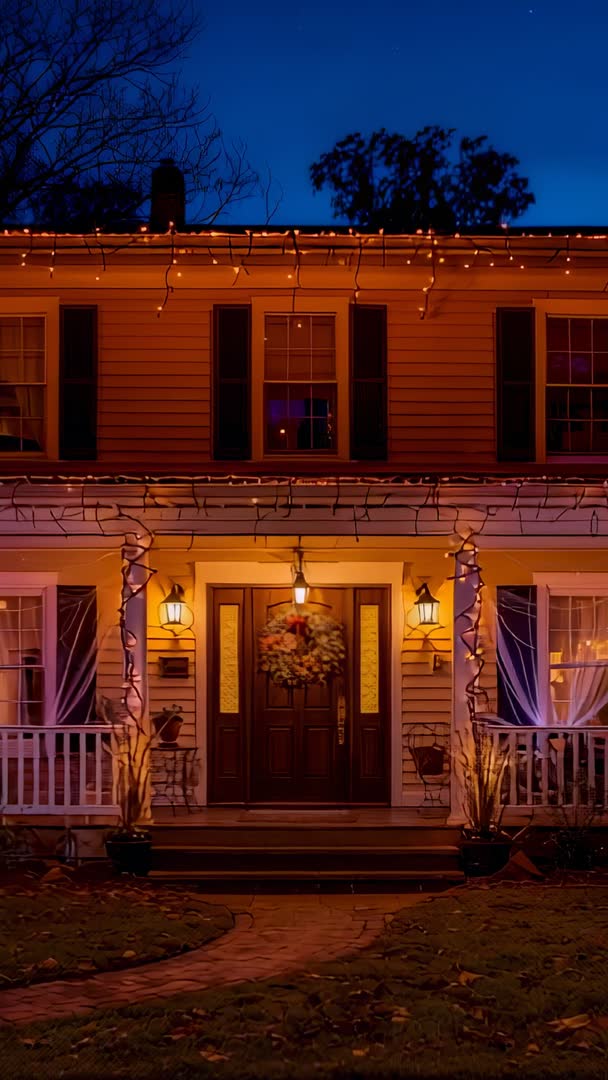 AI Generated Video. Scene showing twilight porch glowing with amber string lights, wreath on front door and cornstalks flanking entrance. Warm lantern light creating cozy, inviting atmosphere against deep blue sky while soft interior glow peeking through windows. Camera holding steady on porch with shallow depth of field, allowing string lights to create gentle bokeh and cinematic warmth. Leaves on lawn and subtle shadows enhancing autumnal mood and seasonal texture. Use for seasonal marketing, fall home staging, real estate listing video, holiday greeting reel, social media short form content, lifestyle b-roll, and background for product or event promotions. Edit-friendly framing supporting text overlay, lower-third, logo placement, and voiceover. Color grading options matching warm-cool contrast for dramatic effect and mood-driven storytelling.