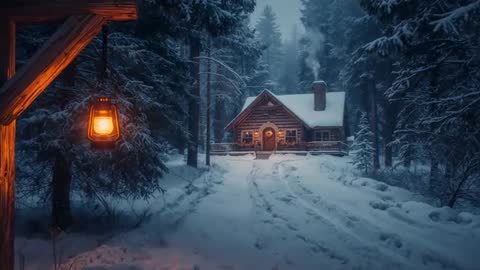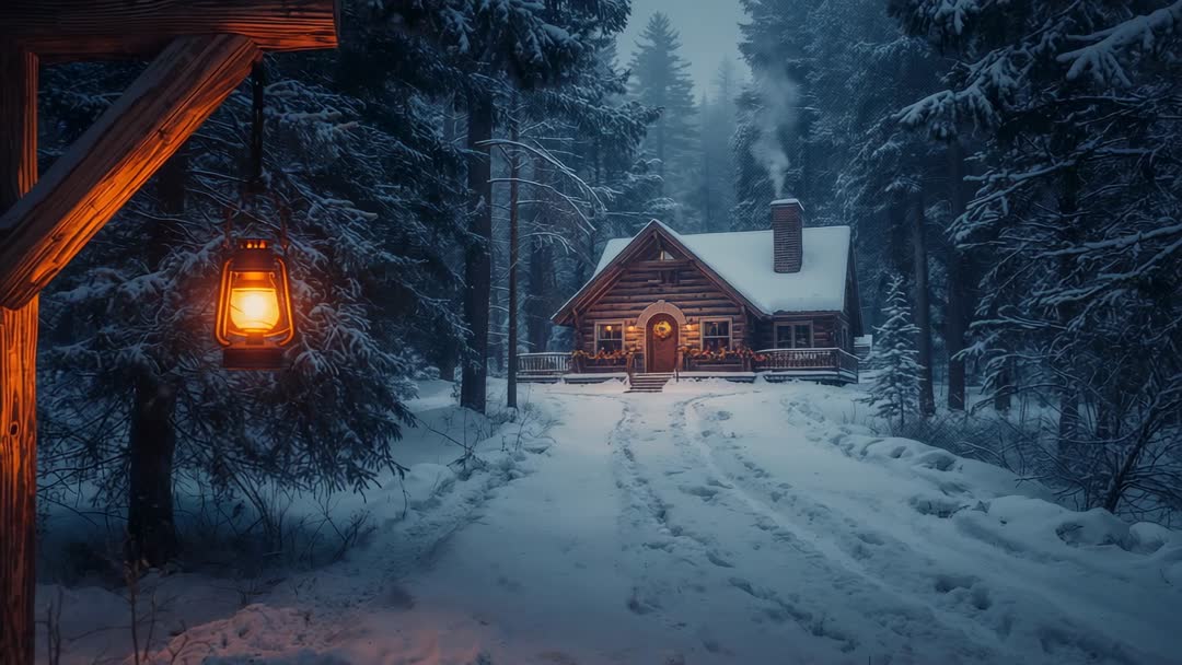 AI Generated Video. Video showing snowy drive leading to secluded log cabin at twilight, with lantern hanging in foreground and warm glow spilling onto snow. Smoke rising from chimney and wreath on door suggesting occupied, cozy interior. Tire tracks in snow creating leading lines toward cabin, adding depth and narrative motion. Cool blue forest tones contrasting with warm lantern light, creating cinematic, seasonal atmosphere. Suitable for holiday greeting videos, winter travel promos, cabin rental adverts, book trailers, streaming title sequences, and social media posts. Working well with overlaid text for event announcements, seasonal sales, or rustic brand campaigns. Offering wide composition for hero banners, website headers, and video backgrounds with safe area for headline placement.