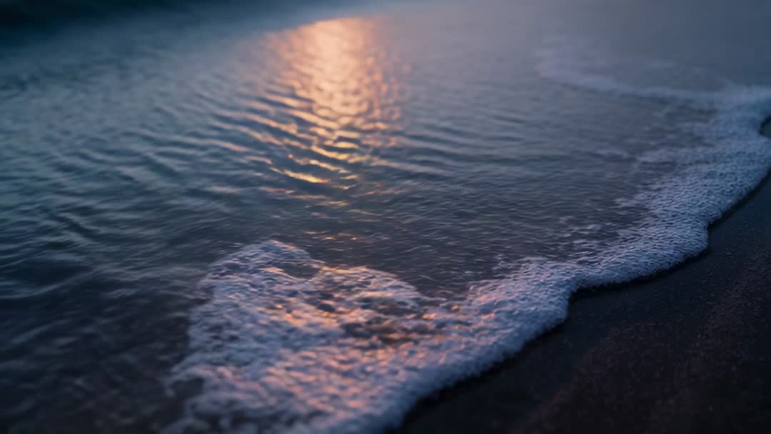 AI Generated Image. Showing close-up cinematic footage of foamy ocean wave gently rolling onto wet sand at twilight, warm sunset light reflecting on rippled water. Featuring soft foam textures, subtle ripples, and cool blue-purple palette meeting warm golden highlights, creating tranquil mood for calm visuals. Offering shallow depth of field, slow-motion potential, loop-friendly composition, and flexible crop room for vertical and horizontal formats. Working well for background footage in relaxation apps, meditation videos, travel promotions, beach resort adverts, social media reels, website hero headers, TV spots, and environmental campaigns. Suitable for mood-setting b-roll, title screen backgrounds, product backdrops, and screensavers.