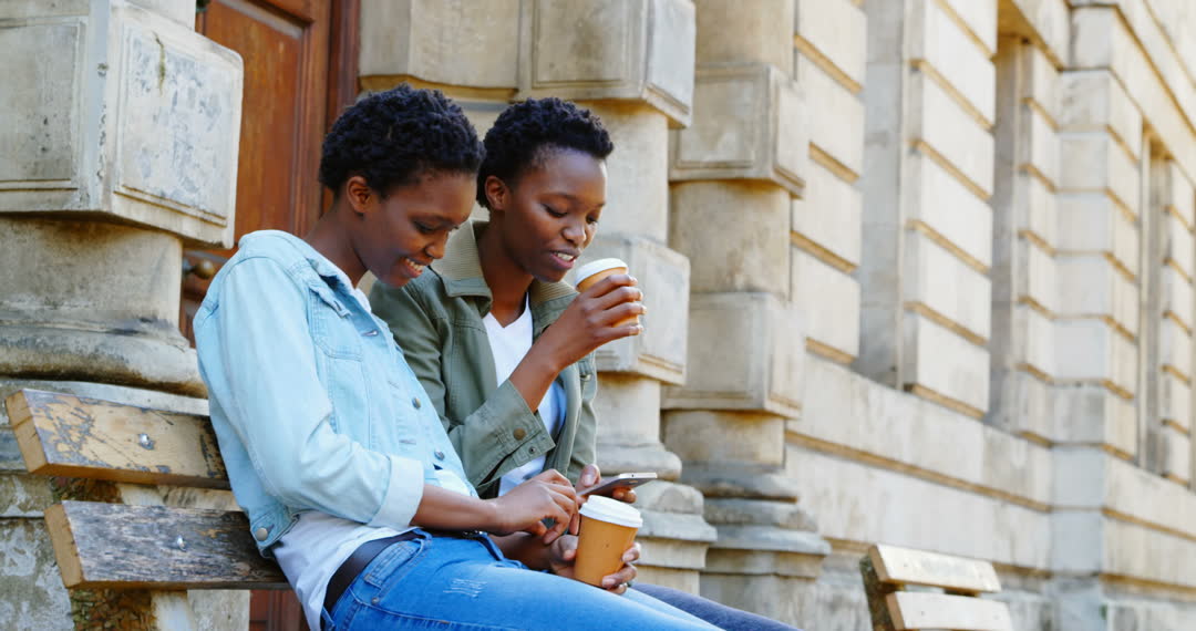 - Twin Sisters Enjoying Coffee and Smartphone in Urban Setting