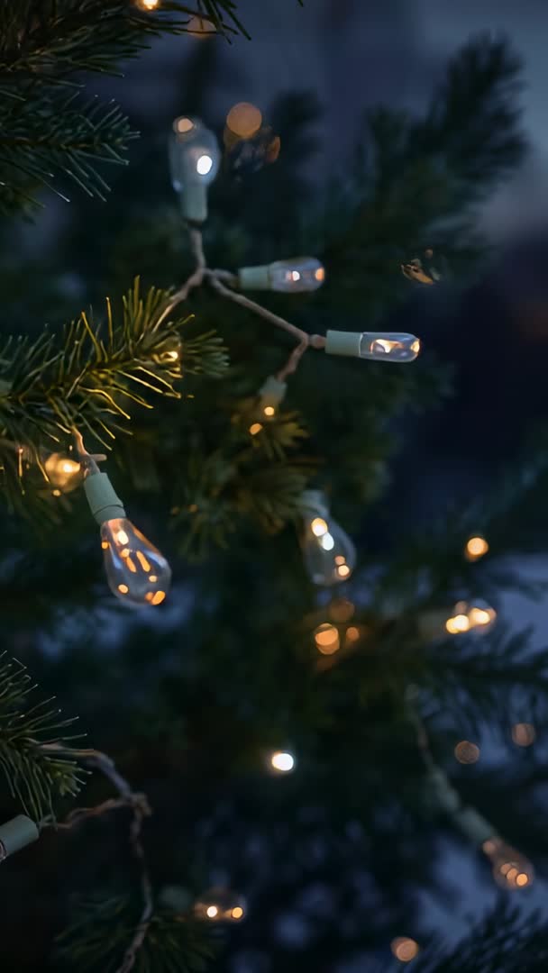 AI Generated Video. Showing close-up pullback of string lights draped on pine branch while breeze is swaying needles and wire. Bulbs are emitting warm amber glow against deep blue twilight sky while shallow depth of field is producing soft bokeh highlights. Vertical 9:16 clip working for social media reels, Instagram stories, TikTok ads, mobile landing screens. Creating cozy holiday mood for seasonal campaigns, greeting videos, storefront loops, product overlays, event trailers. Offering clear area for text overlay or logo placement on blurred background. Pairing well with slow ambient music or subtle wind sound for cinematic atmosphere. Color palette featuring deep greens, warm ambers, cool blues.