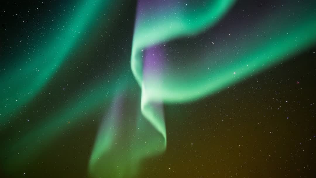 AI Generated Image. Timelapse video showing twisting green and violet auroral curtains reacting to solar wind over star-filled polar sky with warm amber horizon glow. Composition featuring sweeping vertical motion from center outward, layered ribbons of light creating depth and natural leading lines, generous negative space for title, lower-third or logo placement. Use for documentary segments about space weather and astrophysics, educational videos explaining aurora formation and solar activity, travel and tourism promos for Arctic and Nordic destinations, relaxation and meditation backgrounds, broadcast opens and social media reels. Color palette providing dramatic contrast for white or light text and graphic overlays. Loop-friendly footage suitable for ambient installations, website hero banners, desktop wallpapers and gallery prints.