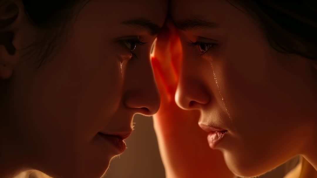 AI Generated Image. Video showing two Asian women touching foreheads in warm backlight, one shedding tears while other soothing with gentle hand. Close-up framing highlighting tears, skin texture, and intimate emotional exchange. Conveying vulnerability, trust, and compassionate support for use in mental health and relationship narratives. Suitable for mental health campaigns, grief or loss stories, counseling and therapy promotion, empathy and support messaging. Works well for social media reels, documentary b-roll, emotional commercial, editorial feature, or film montage. Color grading and slow-motion playback enhancing mood and cinematic impact.