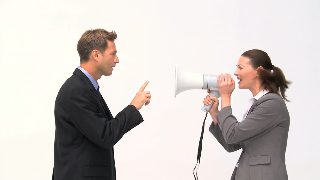 Two Business Professionals Engaged in Active Discussion with Megaphone Video