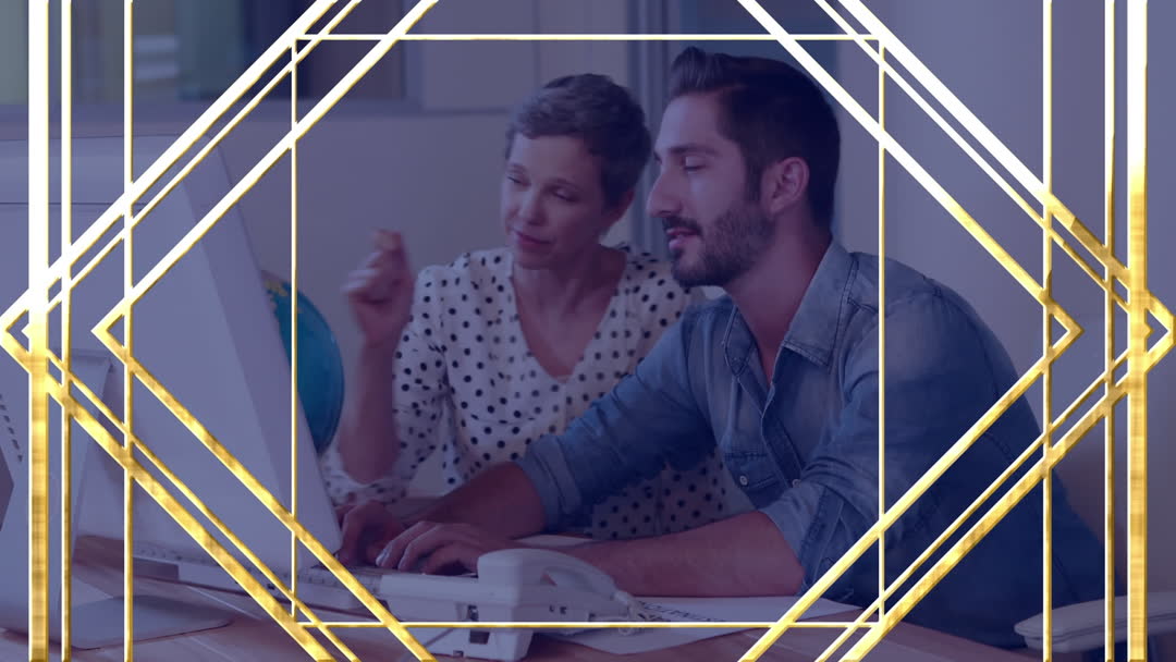 This scene features two business professionals working together on a laptop computer within a casual office environment. The golden frame adds an elegant and stylish touch to the overall composition. This video is perfect for depicting modern business collaboration, coworking environments, and effective teamwork in promotional materials or corporate presentations.