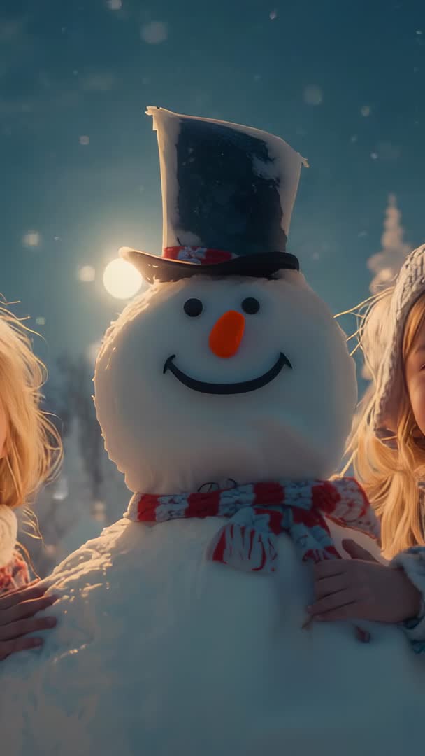 AI Generated Image. Vertical footage showing two children placing hands on smiling snowman while sun peeks behind trees and snowflakes falling. Backlight and lensflare creating warm golden rim light around snowman and faces. Footage fitting 9:16 format for social media platforms like Instagram Reels, TikTok, Stories, mobile ads. Working well for holiday campaign, family blog, winter clothing promotion, seasonal greeting, school or community event highlight. Editing suggestions: applying gentle warm color grade to enhance sunset glow, adding soft slow motion to emphasize falling snow, layering cheerful holiday music and festive typography for greeting or ad. Obtaining model releases recommended when using footage commercially featuring identifiable children.