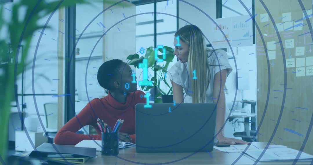 Featuring two female colleagues collaborating over laptop while reviewing project documents with cyan binary overlay and concentric graphics. Showing seated colleague pointing at laptop and standing colleague leaning in for focused discussion, conveying mentorship, teamwork, and hands-on problem solving. Overlay of numeric data and radar-style rings suggesting data visualization, cybersecurity, or tech-driven decision making. Ideal for corporate presentations, website hero videos, training modules, fintech or analytics marketing, social media ads, and B-roll for explainer videos. Easy to edit for color grading, overlay removal, or adding branded motion graphics. Providing natural office light, candid interaction, and modern workplace vibe for storytelling about collaboration, leadership, and digital transformation.