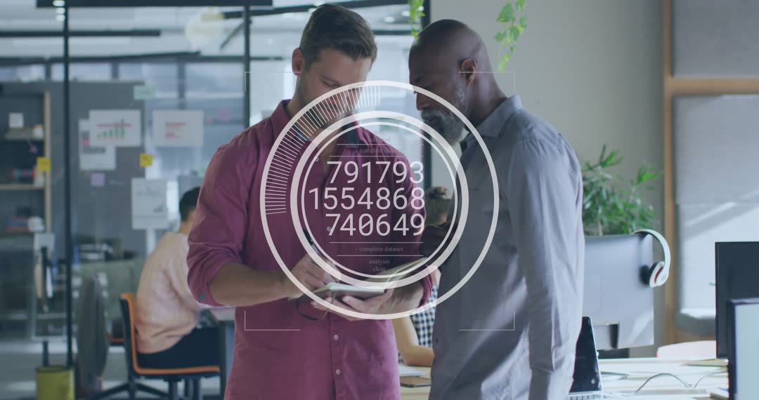 Video showing two colleagues standing in modern open-plan office, reviewing tablet with animated circular HUD overlay displaying numeric metrics and progress rings. Man wearing burgundy shirt holding tablet while colleague in gray shirt leaning in, pointing and discussing insights. Background showing desks, monitors, whiteboard charts, and team members working, creating authentic collaborative atmosphere. Footage conveying teamwork, data-driven decision making, product demo, and digital transformation themes. Use for marketing videos, corporate presentations, website hero banners, SaaS product demos, investor pitches, training materials, and social media ads illustrating collaboration, analytics, dashboard UI, and workplace innovation.