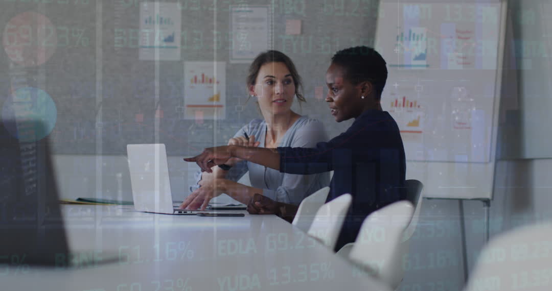 Two businesswomen of different ethnic backgrounds are deeply engaged in analyzing financial data on a laptop. Graphs and statistics are digitally layered over the scene, symbolizing a modern data-driven business environment. This video can be used to depict workplace diversity, financial analysis or collaborative teamwork in contemporary office settings, ideal for business blogs, corporate websites, or technology solutions marketing.