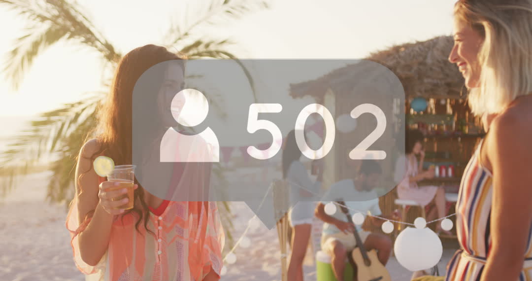 Young women having a conversation on a sunny beach, accompanied by animated social media icons showing increasing popularity. This appeals to themes of social networking, leisure, and summer fun. Ideal for use in advertisements or content centered around social media trends, friendships, or vacation promotion.