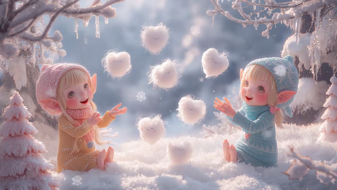 AI Generated Video. Showing two elf children playing and reaching for floating heart snow puffs in backlit snowy forest, wearing knitted hats and cozy winter sweaters. Capturing soft golden backlight, frosty branches, icicles, and fluffy heart sprites gently hovering between joyful kids. Working well for holiday campaigns, children's book animation, greeting cards, social media storytelling, website hero banners, seasonal product packaging, and festive background loops. Including editing suggestions: slow motion loop, gentle snowfall overlay, pastel color grading, vignette softening, and subtitle captions for short reels. Mood conveying wonder, innocence, warmth despite chilly environment. Serving well for family-friendly marketing, toy packaging, nursery decor, seasonal greeting designs, and animated short projects.