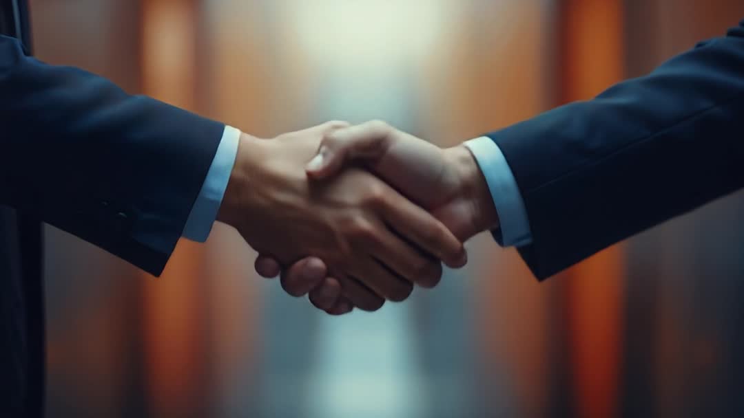 AI Generated Image. Video showing two executives shaking hands in office corridor, capturing tight closeup focusing on clasped hands and light-blue cuffs. Warm background bokeh and directional lighting creating professional, cinematic tone. Suits and cuffs signaling corporate context and mutual agreement. Clip conveying trust, collaboration, negotiation success and formal greeting. Ideal for business presentations, corporate websites, deal announcement pages, negotiation articles, partnership press releases, training modules, social media posts promoting collaboration. Suitable for use as opener for corporate videos, lower-third background for headline text, hero banner for partnership campaigns, or overlayed with logo and call-to-action. Working well with centered crop and letterbox formats, supporting 16:9 and 4:3, loop-friendly for seamless playback.