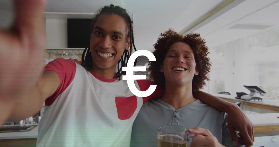 - Two Friends Celebrating with Euro Symbol in a Bar