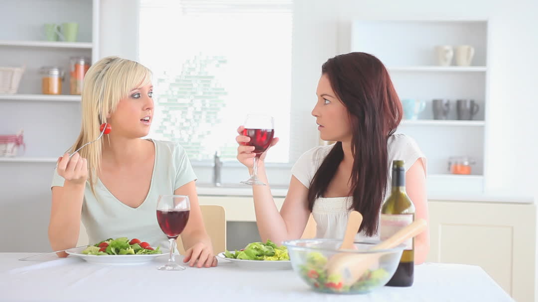 Two friends are dining at a table in a modern kitchen environment, engaging in lively conversation. Both are enjoying red wine and fresh salads, suggesting a focus on healthy living and social interaction. Use this video for lifestyle articles, health and wellness blogs, or content centered on social gatherings.