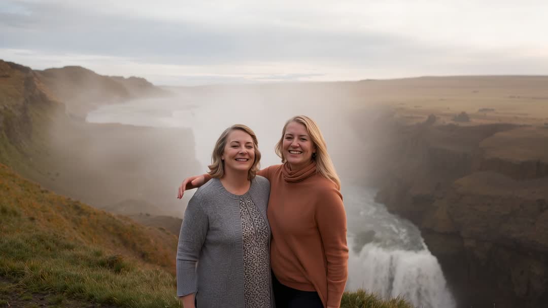 AI Generated Image. Video showing two middle-aged women smiling and hugging on grass clifftop with waterfall mist rising behind them. Composition capturing sweeping canyon, powerful cascade, wide plateau horizon, and atmospheric mist, offering cinematic scale and mood. Footage working well for travel and tourism promos, adventure and outdoor lifestyle content, friendship and family campaigns, wellness and retreat marketing, social media stories, and website hero banners. Ideal for editorial travel pieces, brochure videos, guided tour websites, greeting card animations, and stock footage libraries requiring emotive human connection in nature. Warm earthy tones in clothing contrasting cool misty landscape, enabling easy color grading and overlay text placement for titles and captions.